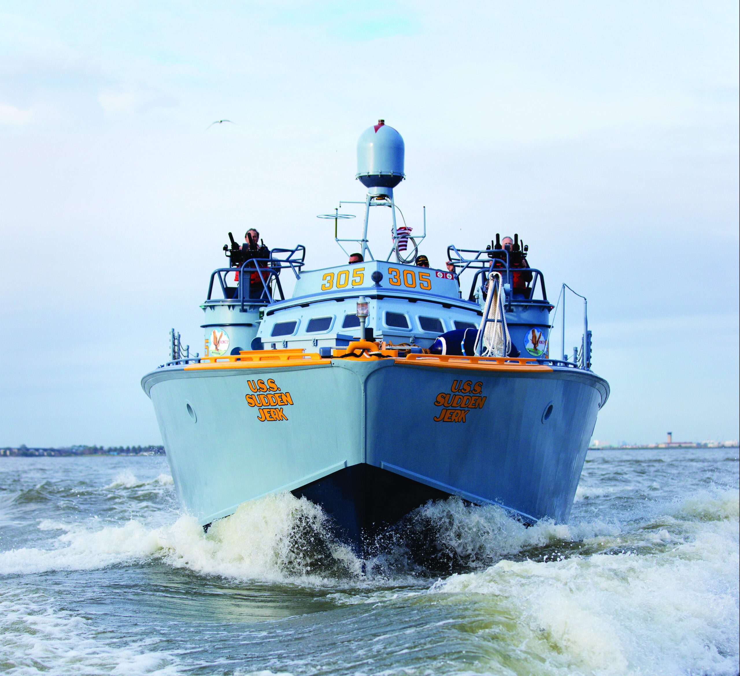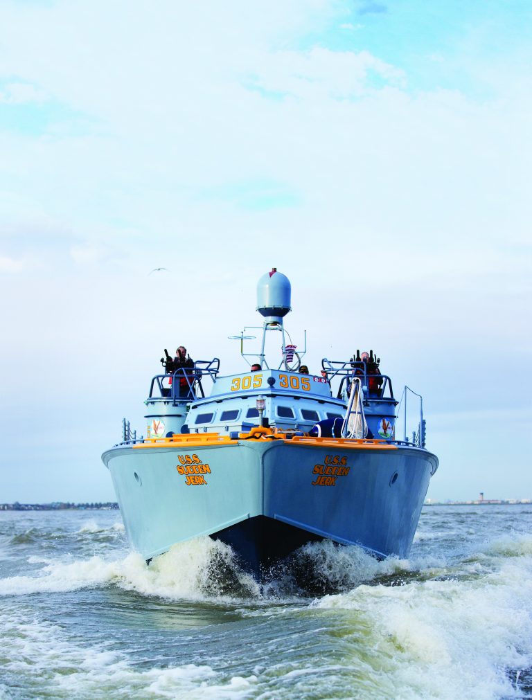 Patrol torpedo boats were fast, heavily armed ships used for cutting enemy supply lines. The PT-305, known as the USS Sudden Jerk, was built in New Orleans by Higgins Industries in 1943. The PT-305 was part of a 12-ship squadron during World War II, serving from 1944 until the end of the war in 1945. During the war, the PT-305 sank three enemy ships and took part in two invasions. Post-service, the PT-305 underwent significant transformations as a tour boat, fishing charter and oyster boat. In 2007, The National WWII Museum acquired the torpedo boat and began the painstaking reconstruction to reclaim its original appearance.